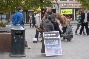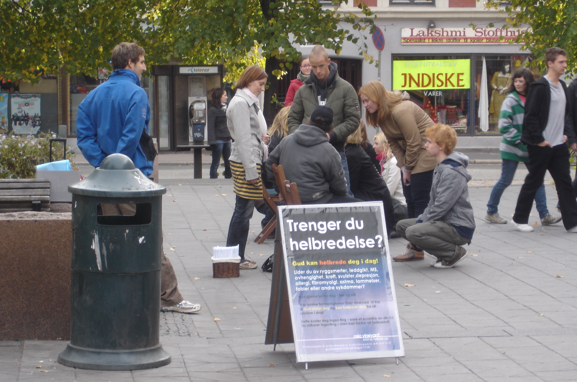 som inviterer til helbredelse og så deles det ut flyers som inviterer til forbønn. Alle som blir bedt for og som ønsker det får med seg et skriv som forteller kort om hvem vi er, hvorfor vi gjør dette og hva de selv kan gjøre.